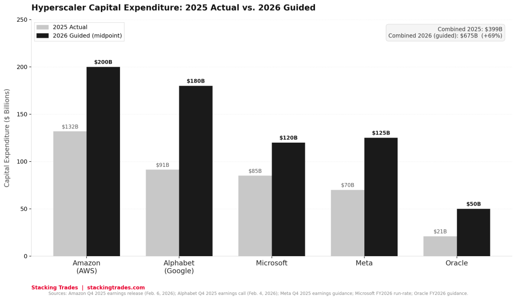 The number that stopped investors cold was not a loss or a miss. It was a capex forecast. When Amazon reported fourth-quarter earnings on February 6, CEO Andy Jassy committed to spending $200 billion in capital expenditures across Amazon in 2026 — more than the company generated in operating cash flow in 2025. Within days, Alphabet had disclosed plans for $175 billion to $185 billion in its own 2026 capex spend. Meta had already told investors it would invest between $115 billion and $135 billion. Microsoft is tracking toward $120 billion or more. Oracle has guided to $50 billion, a 136% increase over 2025.