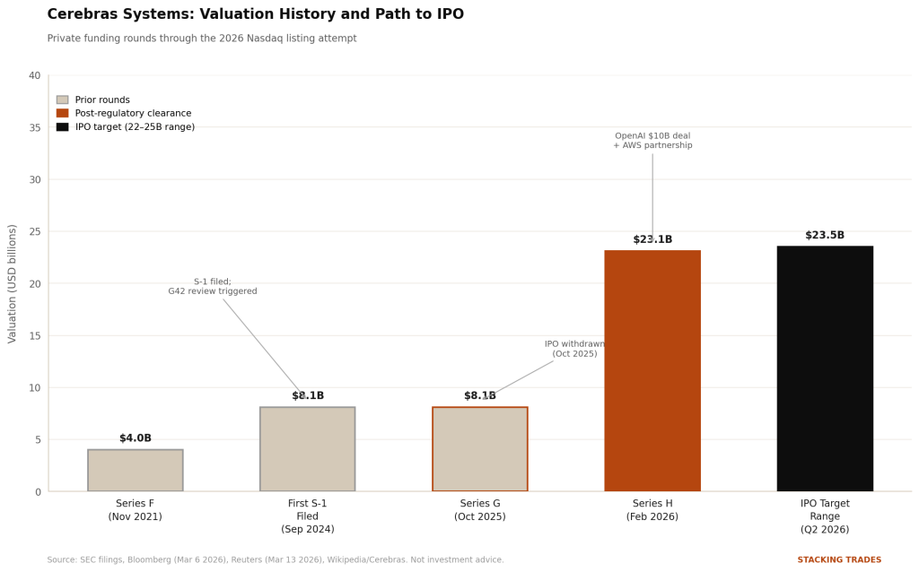 That chapter is closed. G42 has since been removed from Cerebras’s primary shareholder structure to satisfy U.S. regulators, and the company has spent the months since building a customer base that looks nothing like the one in that first S-1. In January 2026, Cerebras signed a $10 billion compute deal with OpenAI, pledging 750 megawatts of computing capacity through 2028. In March, it announced a partnership with Amazon Web Services to deploy its CS-3 systems inside AWS data centers, available through Amazon Bedrock. The company is now valued at $23.1 billion after a February Series H round and is targeting a roughly $2 billion raise on the Nasdaq, with Morgan Stanley as lead underwriter, according to Bloomberg.