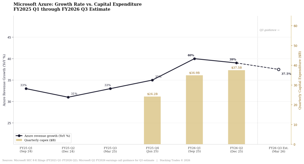 Microsoft’s fiscal Q3 ends March 31, 2026. The company guided Azure growth of 37% to 38% in constant currency for the quarter — a range that is deliberately in line with analyst consensus rather than above it, which is itself a change in posture from quarters past when Microsoft consistently guided conservatively and beat by a meaningful margin.