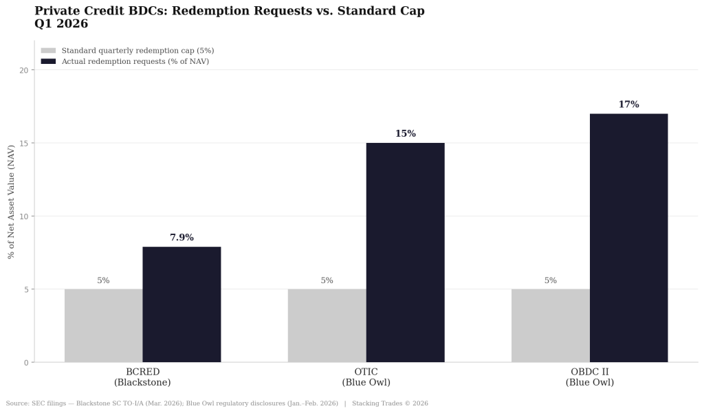 The headlines out of the private credit industry this quarter have been stark. Blackstone allowed investors to pull a record 7.9% of assets from its flagship $82 billion private credit fund — well above the standard 5% quarterly cap — after fielding roughly $3.8 billion in withdrawal requests. Blue Owl had it worse. Its technology-focused business development company saw redemption requests hit 15% of net asset value; a separate fund was gated entirely, with Blue Owl replacing quarterly tender offers with rateable return-of-capital distributions.