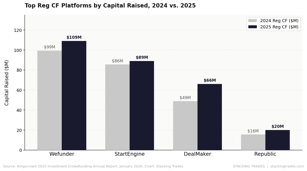 The platforms are not interchangeable, and the distinction matters more as the market matures. Reg CF raised $378 million in 2025 across a shrinking number of new offerings — 20% fewer launches than in 2024, with capital concentrating in a smaller cohort of higher-quality raises. Nine campaigns hit the $5 million cap, triple the prior year. One hundred and one crossed $1 million. The median equity raise, however, sat at $194,000, meaning half of all issuers raised less than that. As we covered earlier this year, a formal SEC petition to raise the Reg CF cap from $5 million to $20 million is now on file — if that passes, the platforms with the infrastructure and investor base to handle larger, more complex raises will capture a disproportionate share of the expanded market.